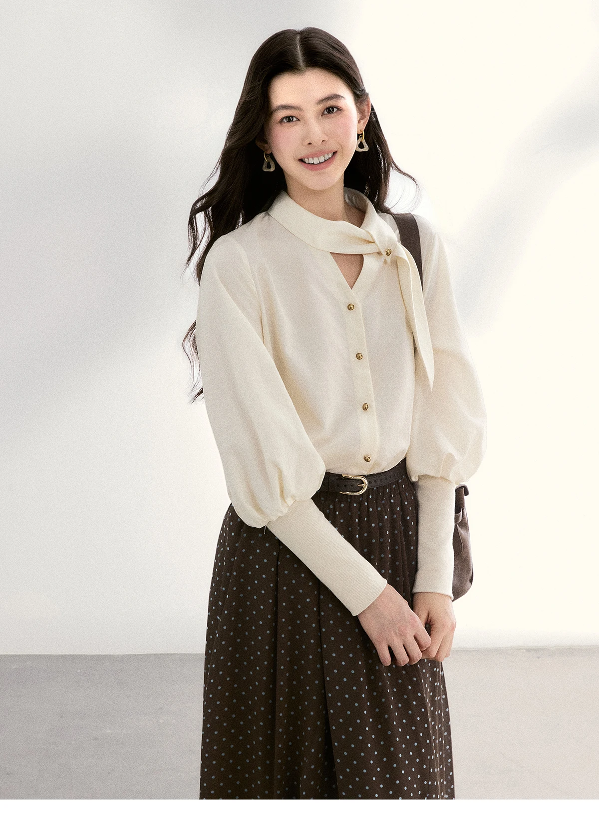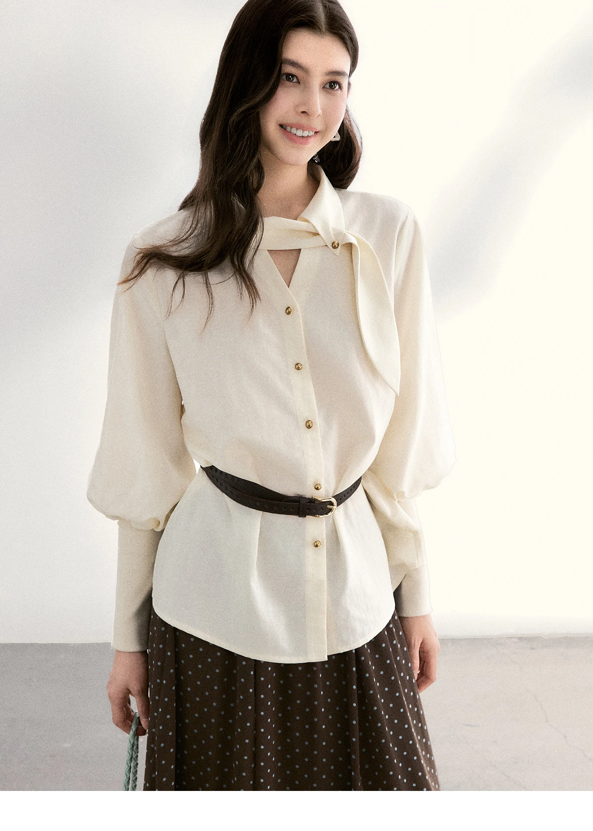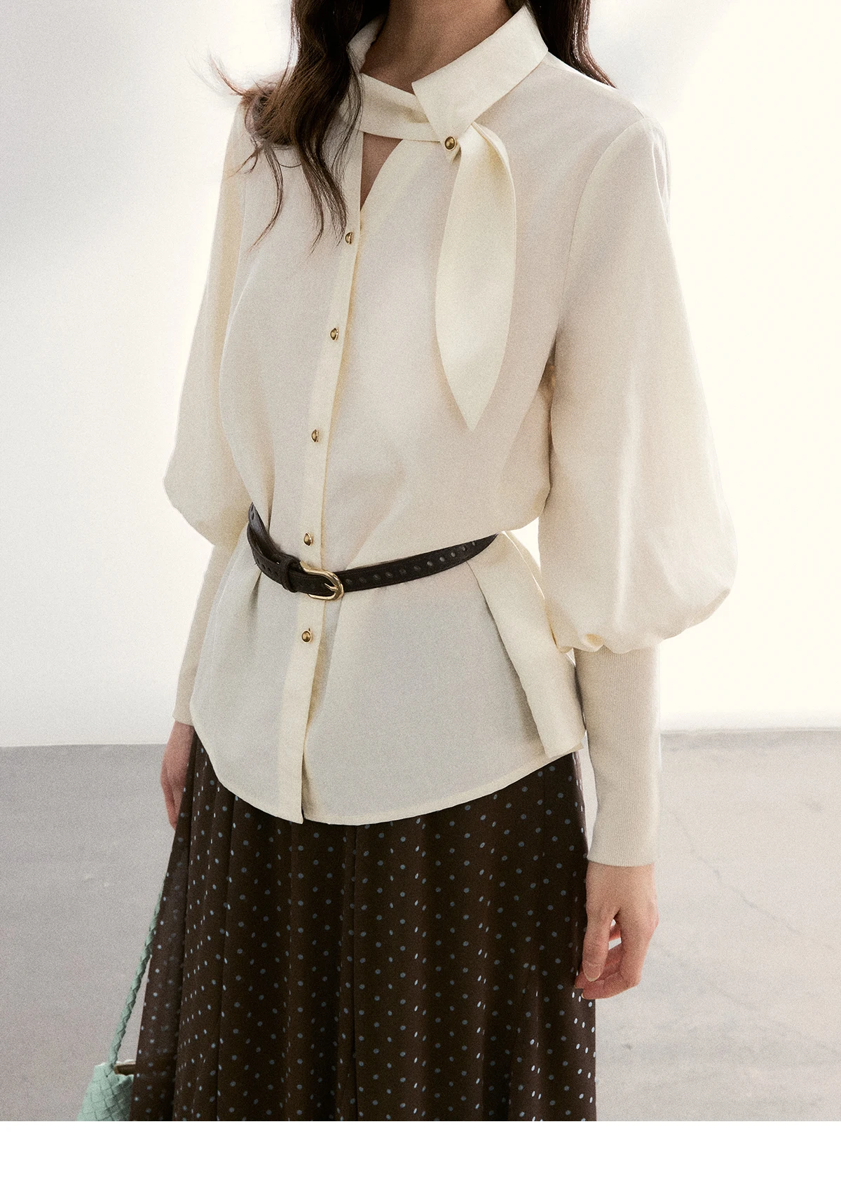 MISHOW Women's Tie Neck Shirts Spring Hollow-out Knitted Patchwork Puff Sleeve Tops Casual Elegant Shirt Office Lady MXF108C0812