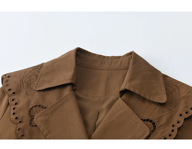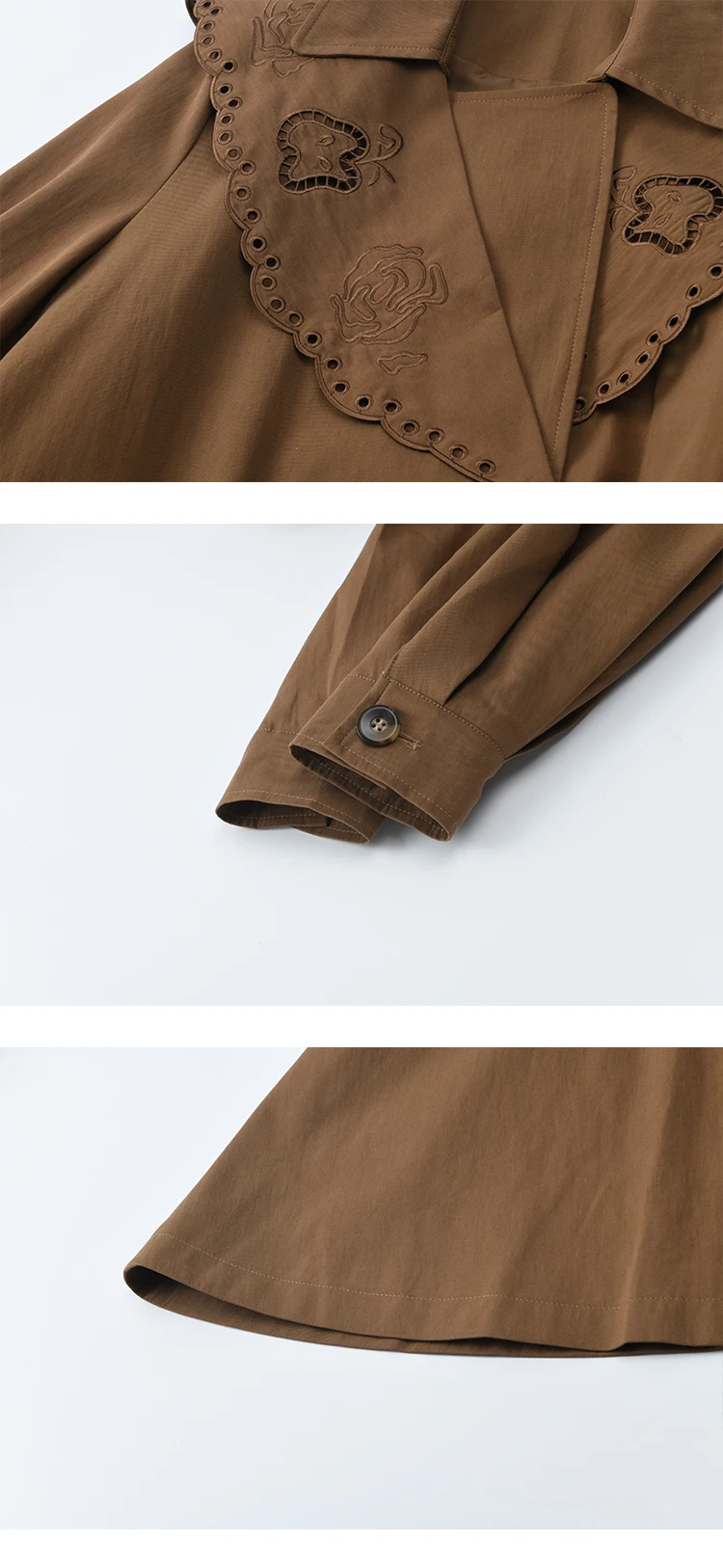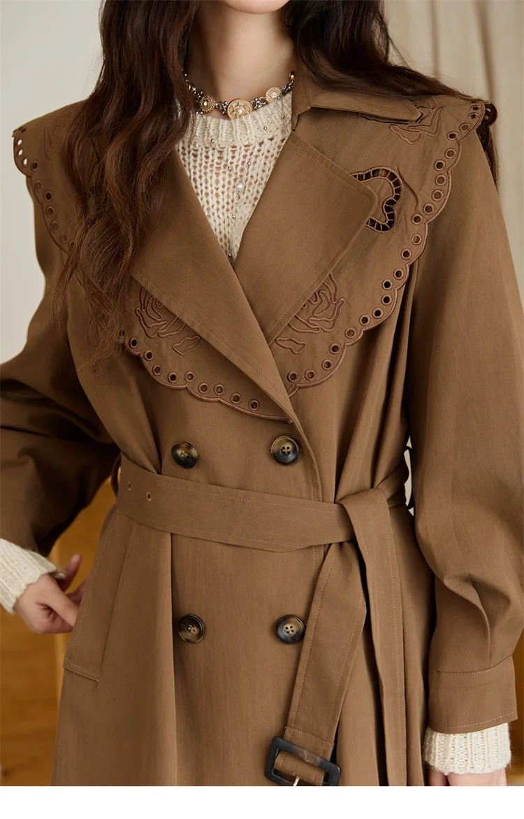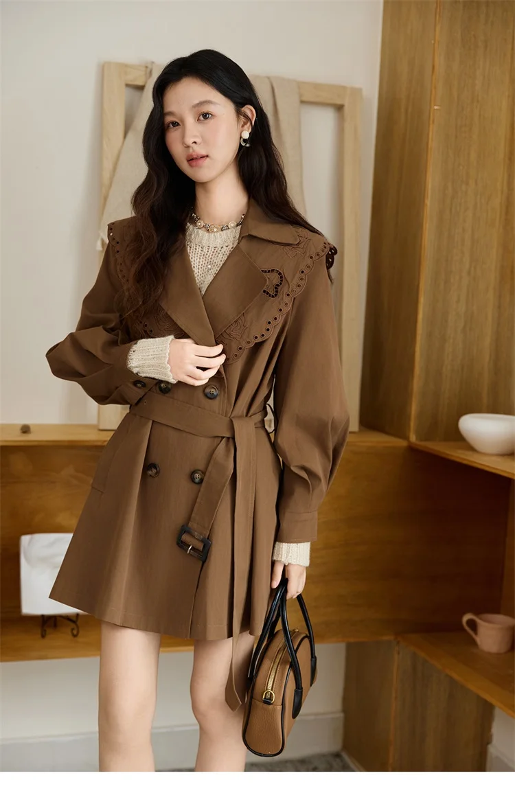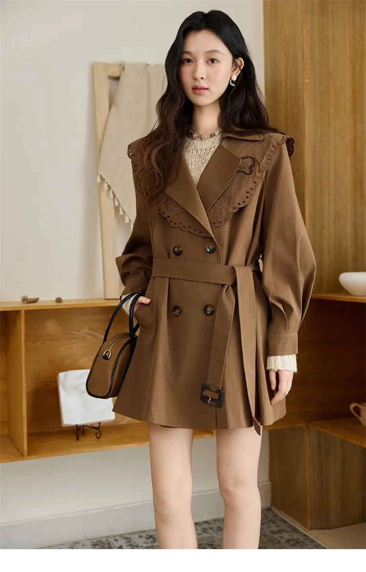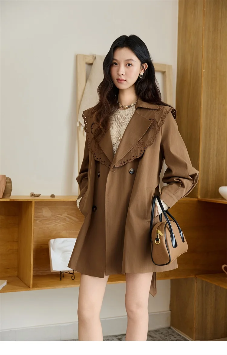 MISHOW Women's Trench Coat 2025 Autumn Hollow Embroidery Mid-length Windbreaker Double-breasted Belt Retro Jacket MXE46W0862