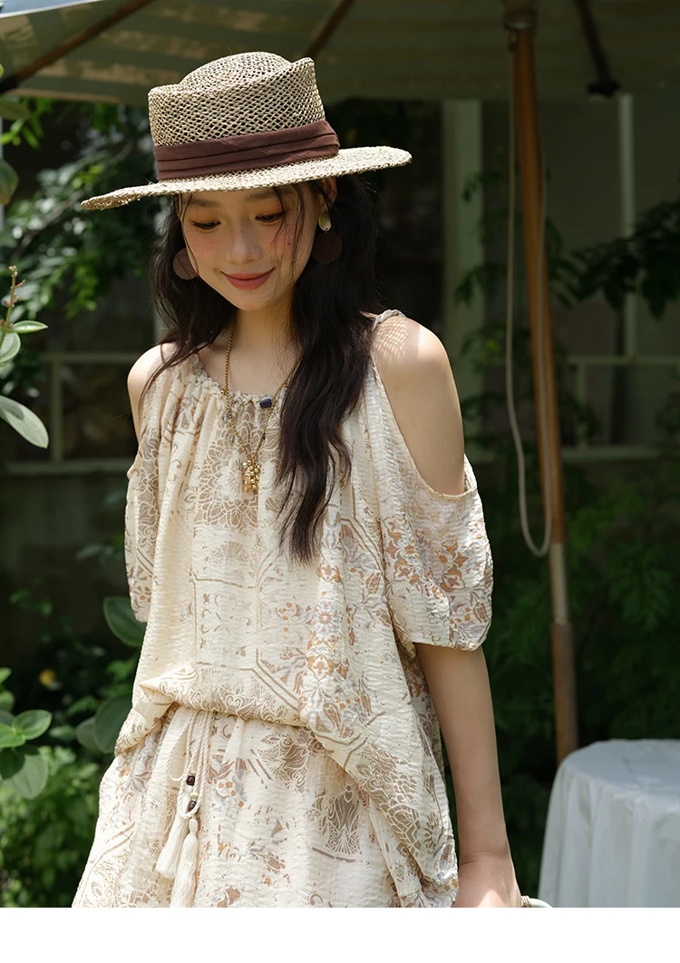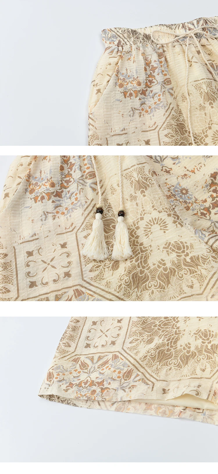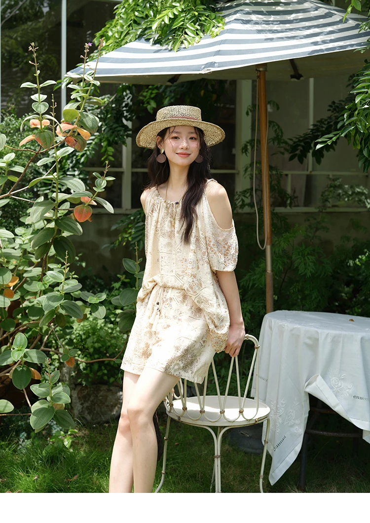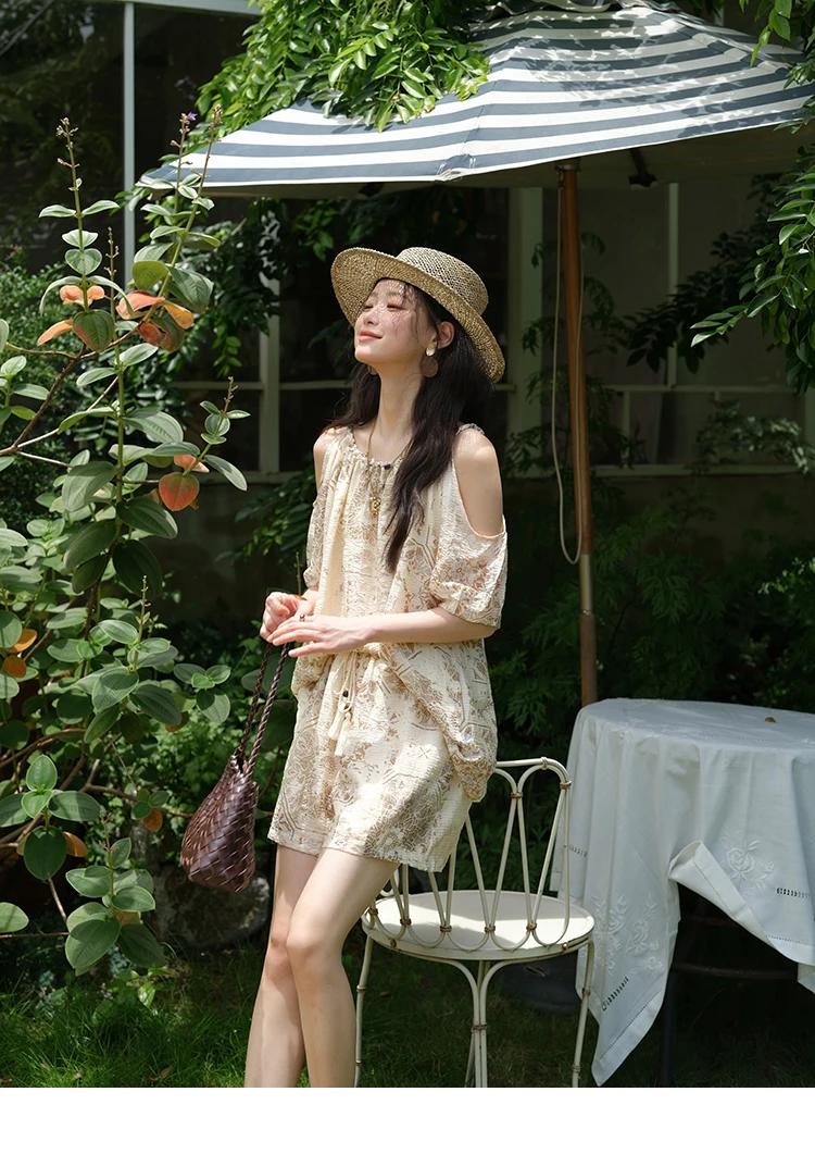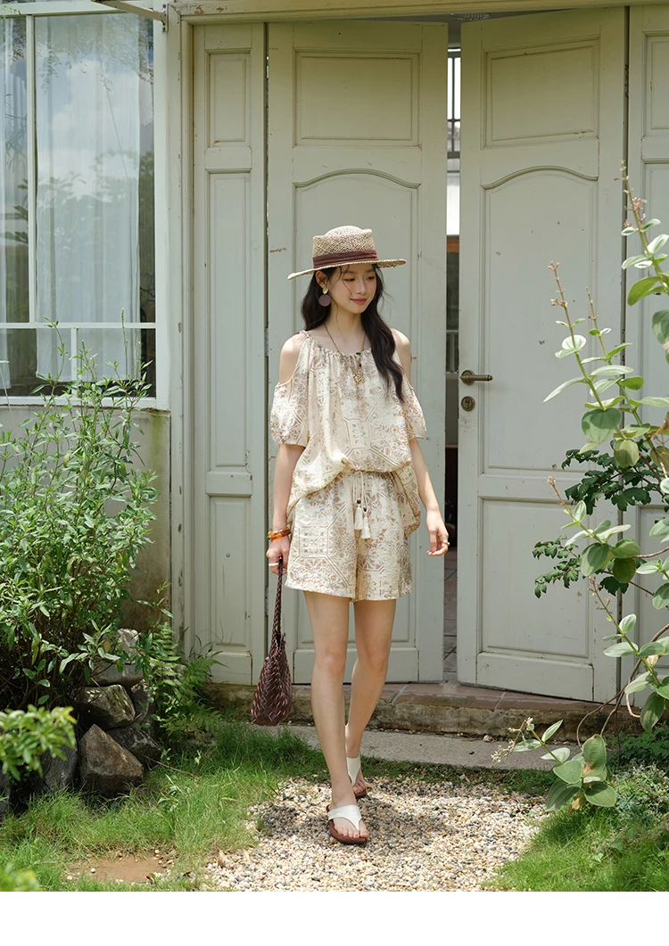 MISHOW Women's Two Piece Set 2025 Summer New Casual Bohemian Print Top Beaded Tassel Drawstring Pocket Shorts Set MXE39T0723