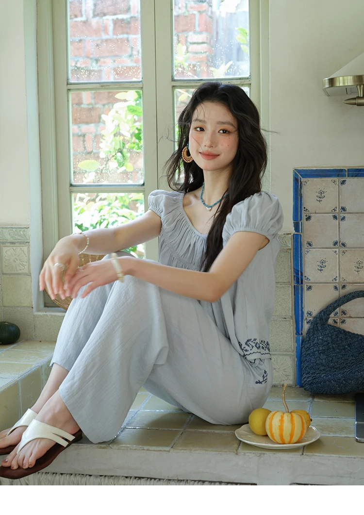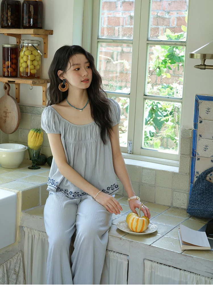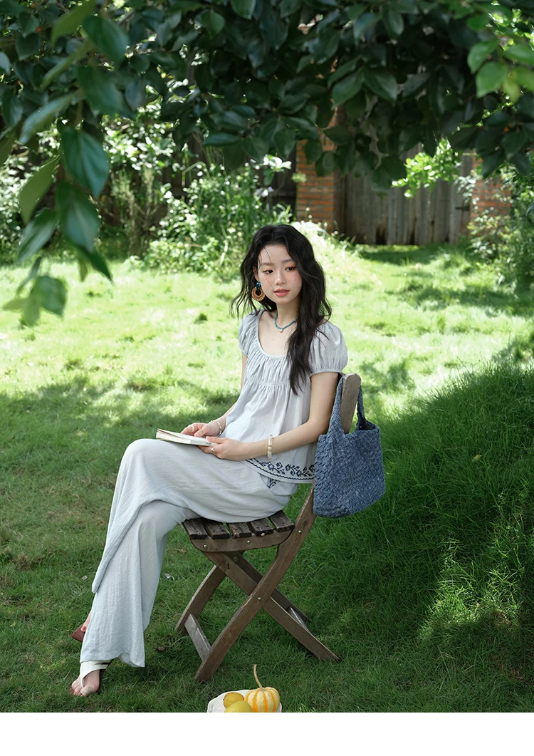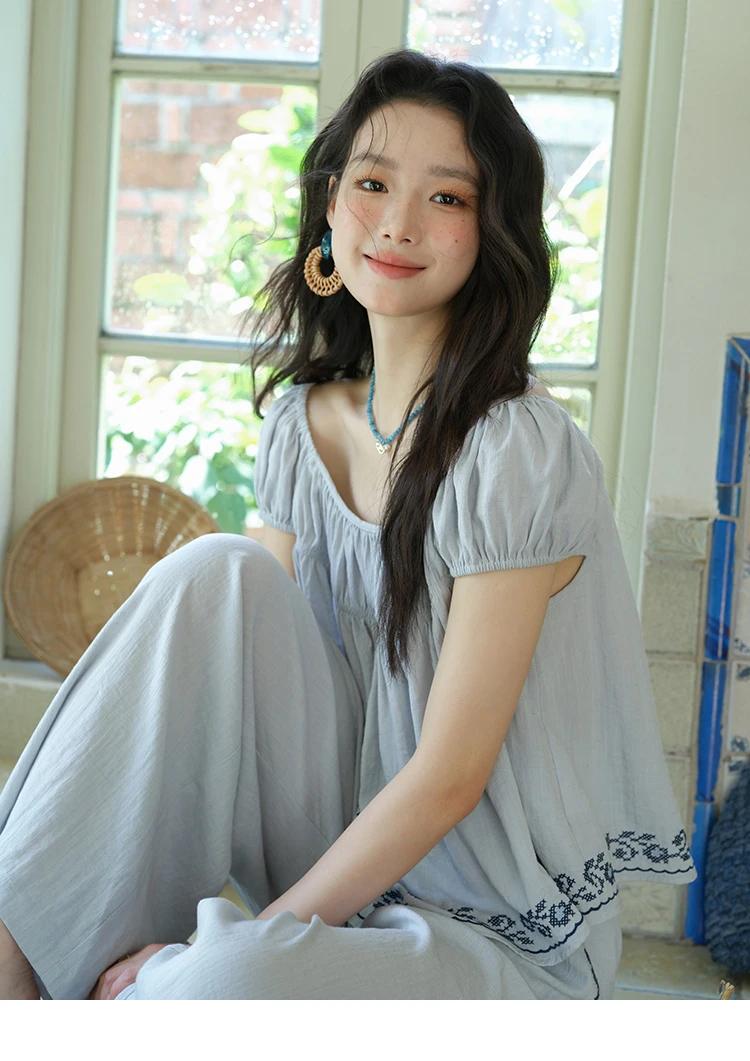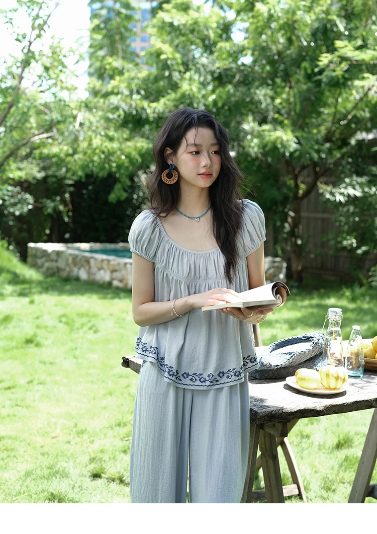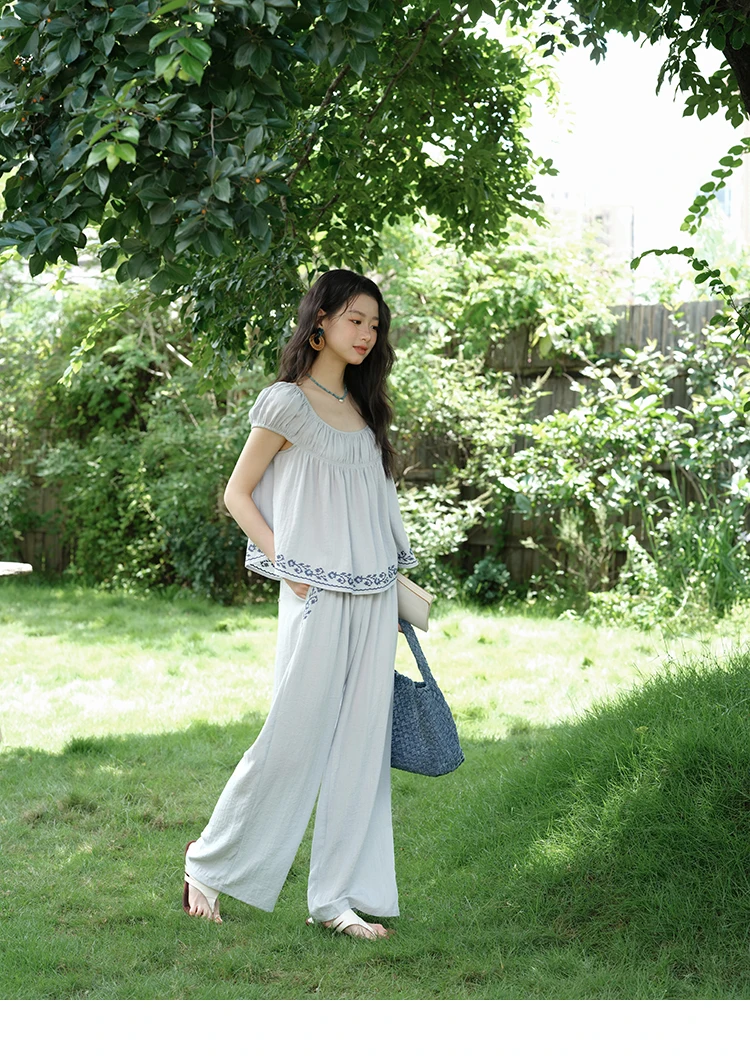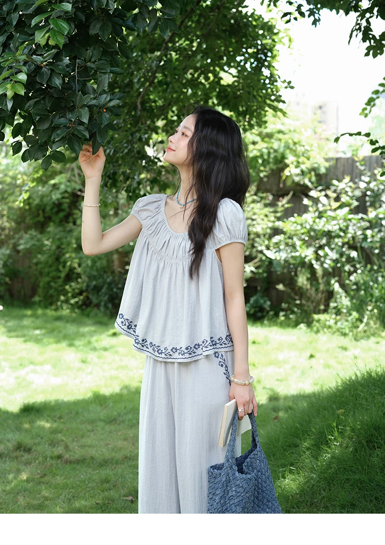 MISHOW Women's Two Piece Set 2025 Summer New Embroidery Flower Round Neck Blouse Fashion Pocket Wide Leg Pants Set MXE39T0669