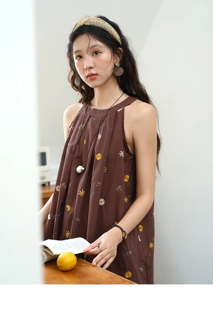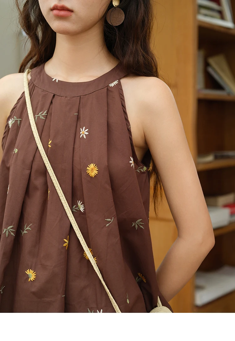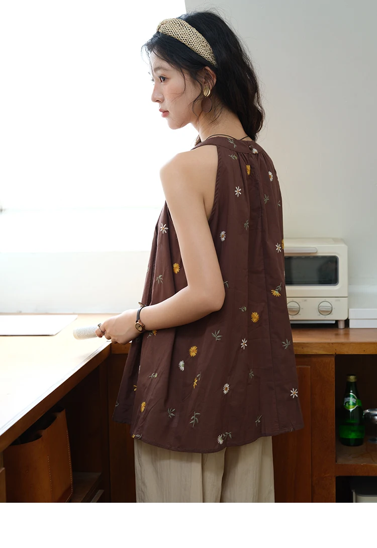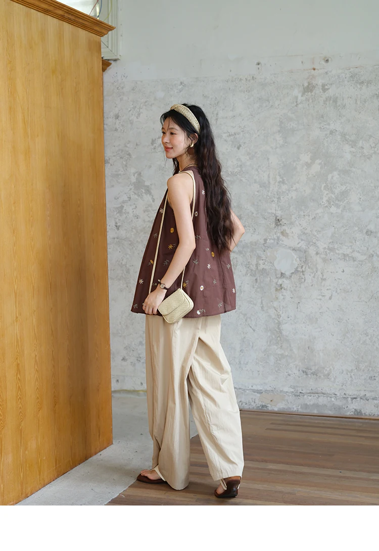 MISHOW Women's Two Piece Set 2025 Summer New Embroidery Hanging Neck Sleeveless Top Retro Khaki Wide Leg Pants Set MXE39T0713