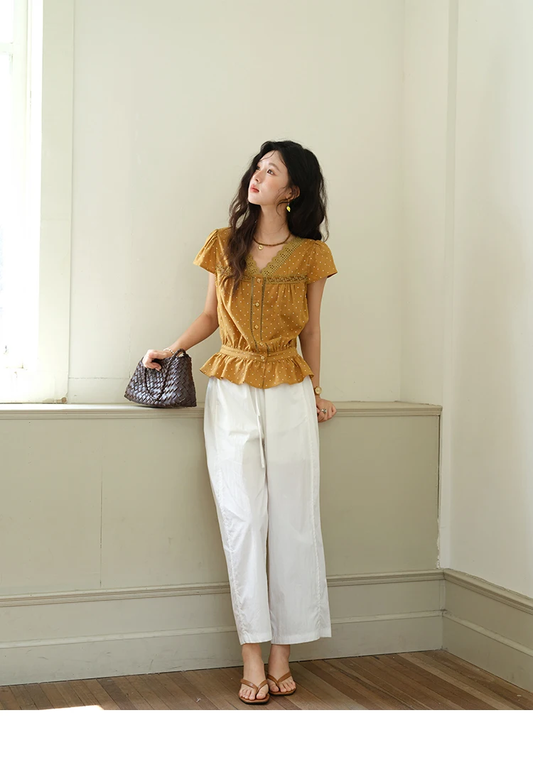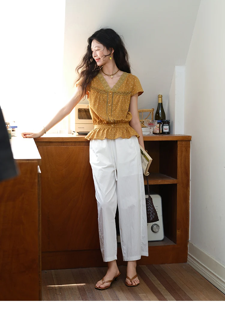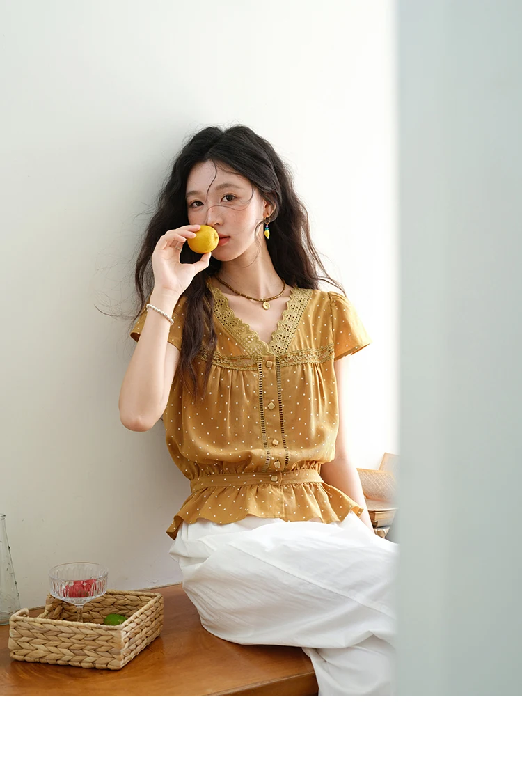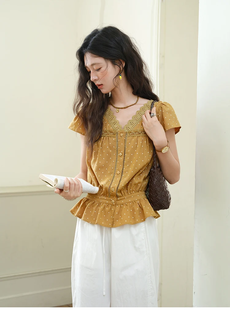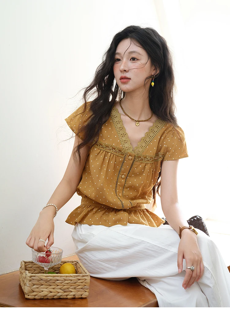 MISHOW Women's V-neck Lace Splicing Blouse 2025 Summer New Ladies Fashion Polka Dot Hollow Ruffle Button Female Top MXE38X1847