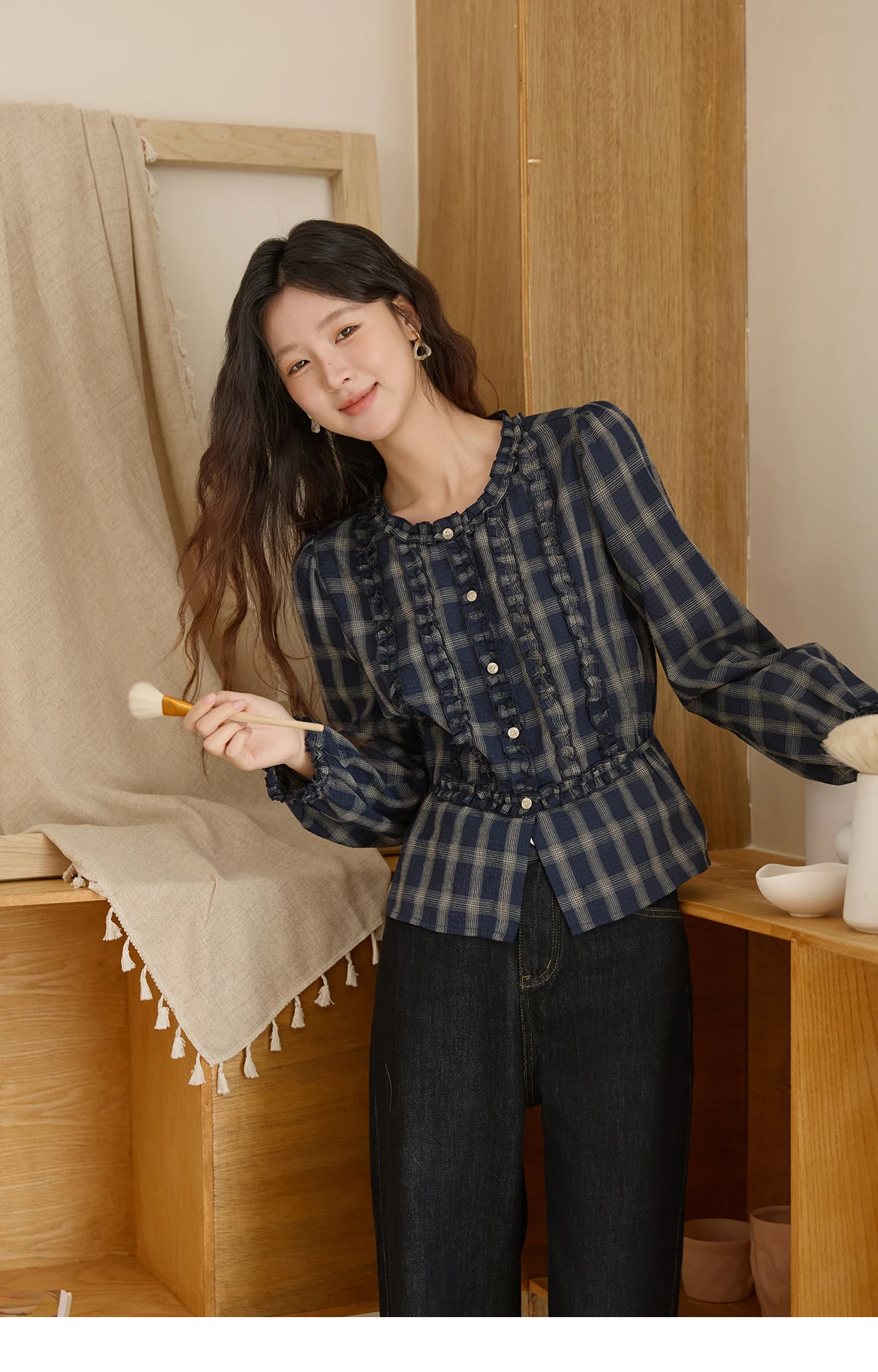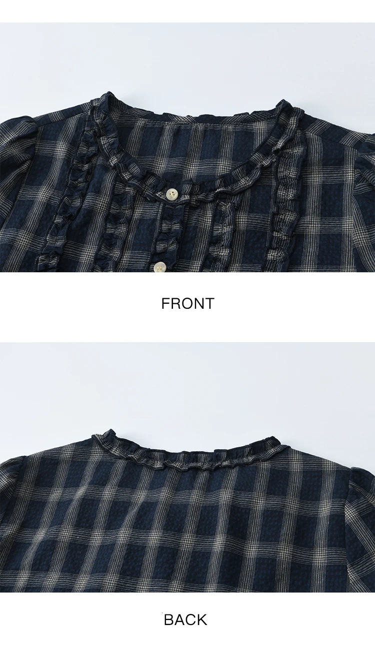 MISHOW Women's Vintage Blue Plaid Shirt 2025 Autumn New Elegant Luxury Loose Waist Shirts Round Neck Long Sleeved Top MXE45X2480