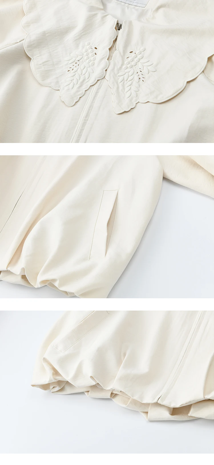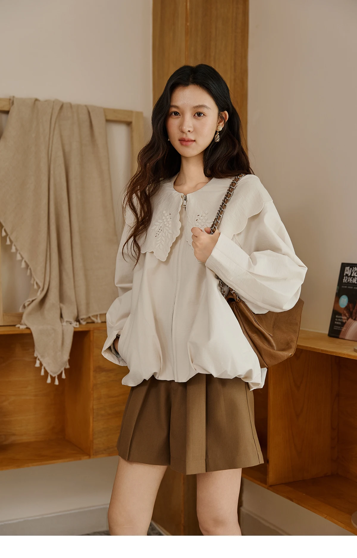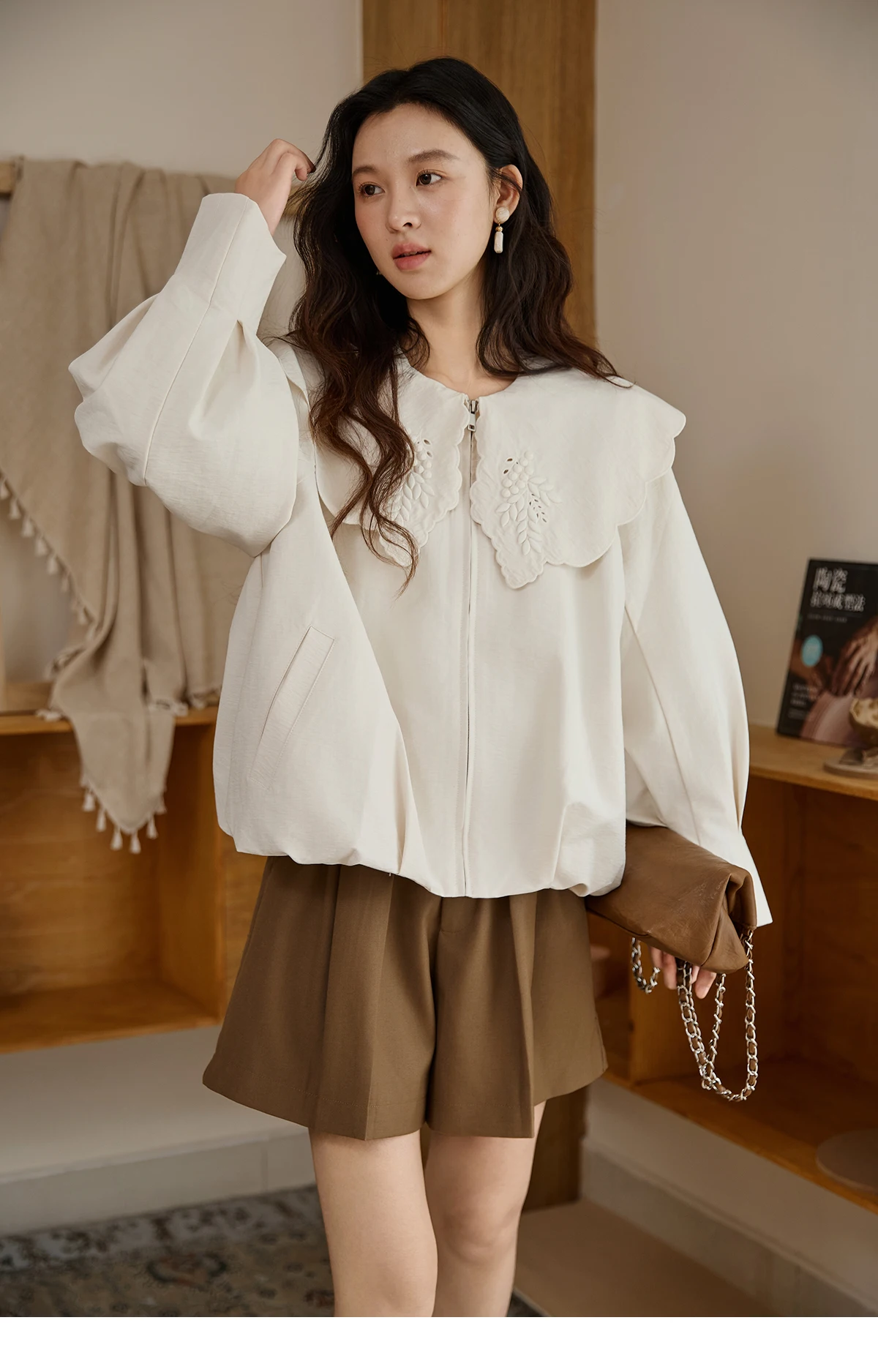 MISHOW Women's Wheat Sprout Embroidery Coat Autumn 2025 Beige Doll Collar Hem Folded Short Coats Loose Zipper Jackets MXE45W0860