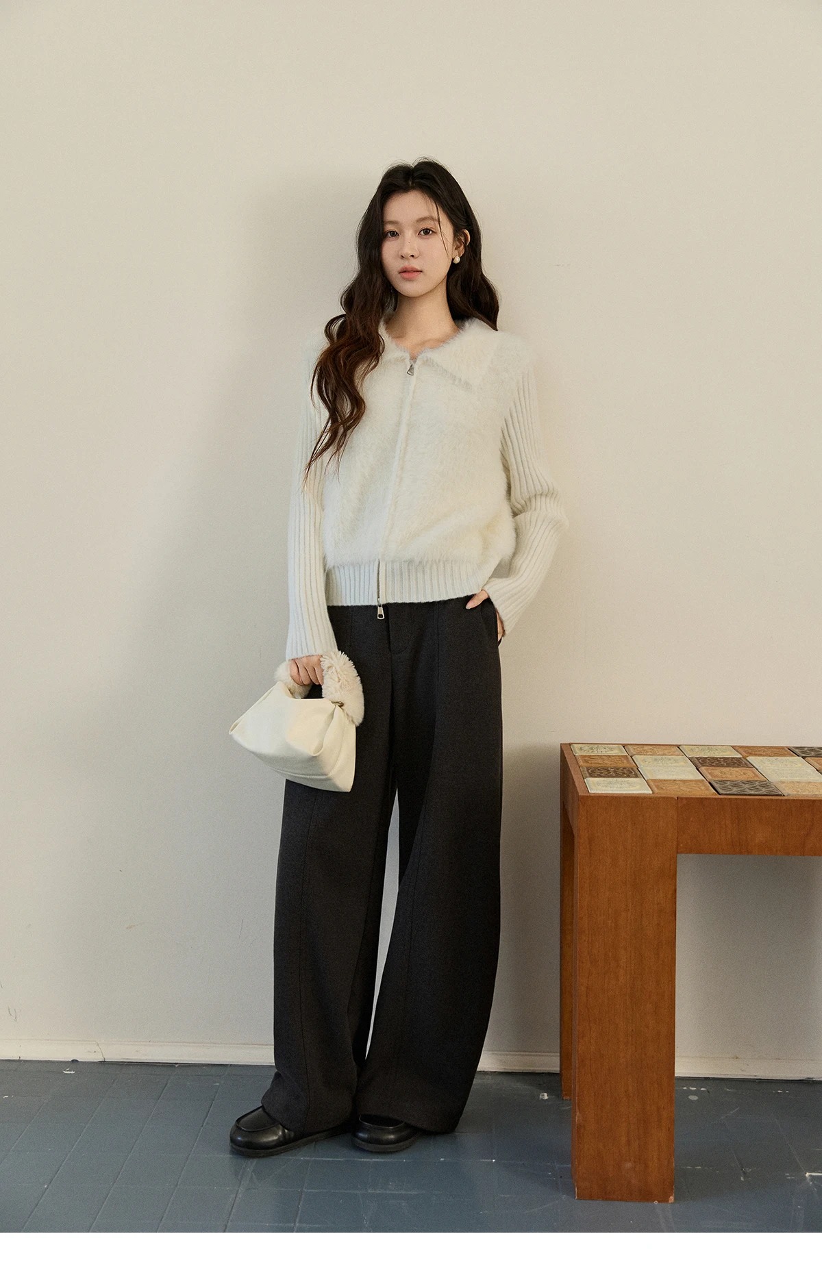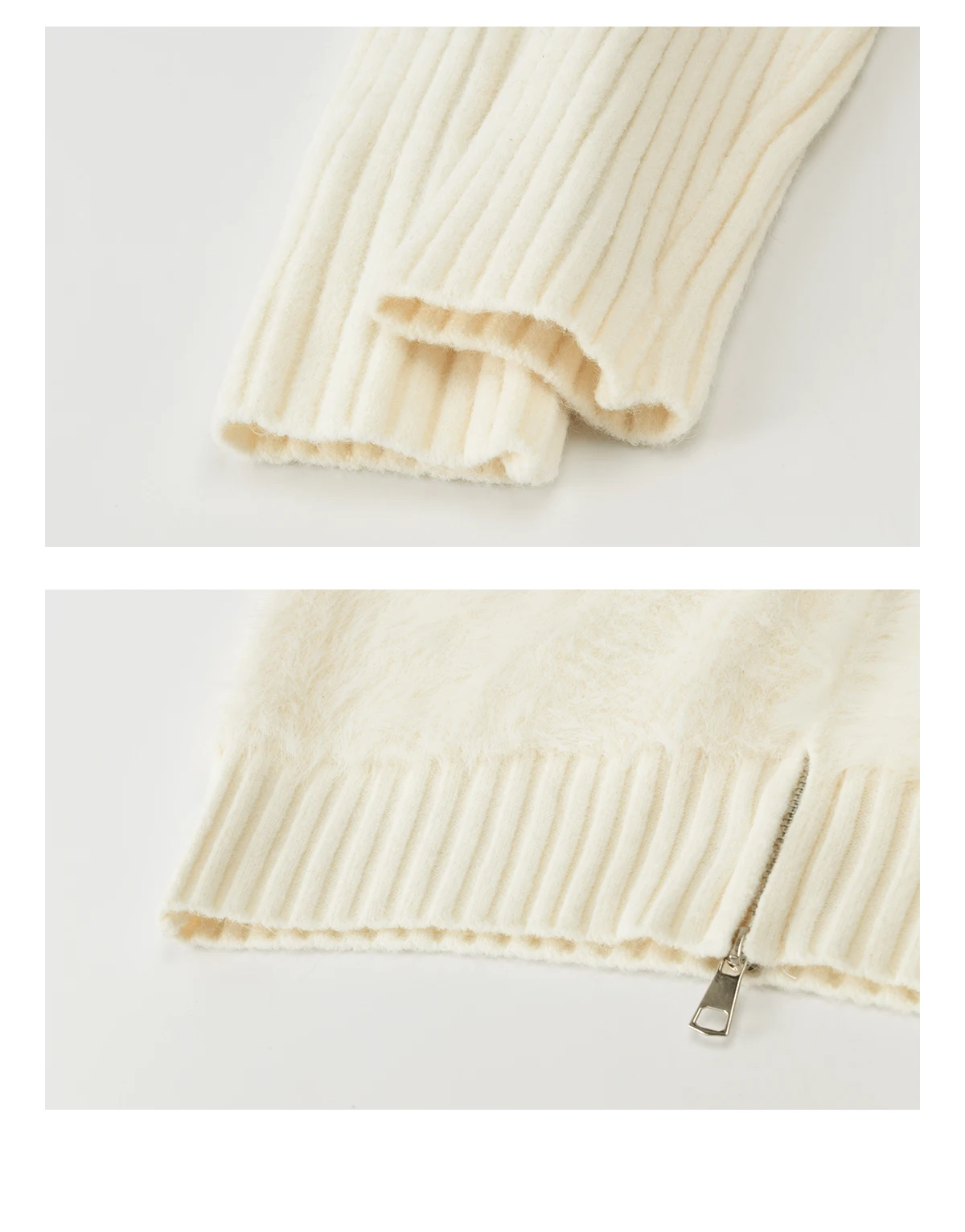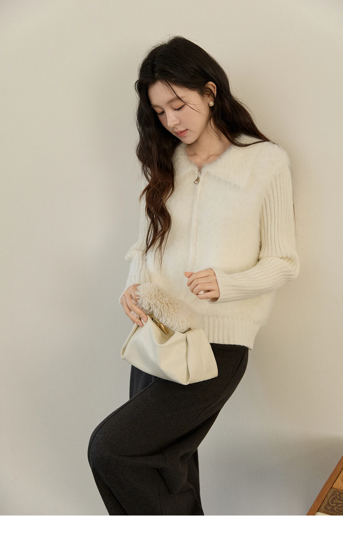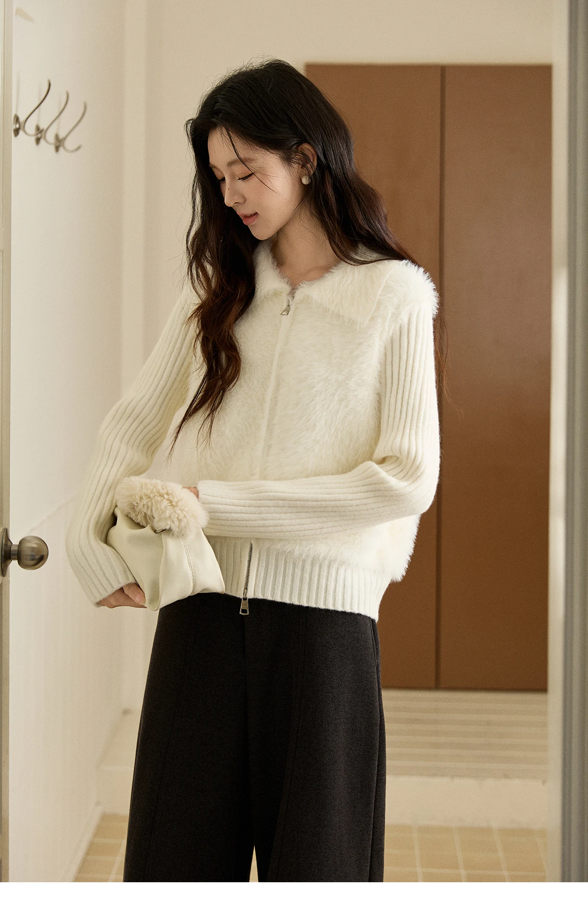 MISHOW Women's White Faux Fur Knit Cardigan 2025 Autumn Winter Fake Two-Piece Zipper Lapel Collar Warm Soft Outerwear MXE94Z2992