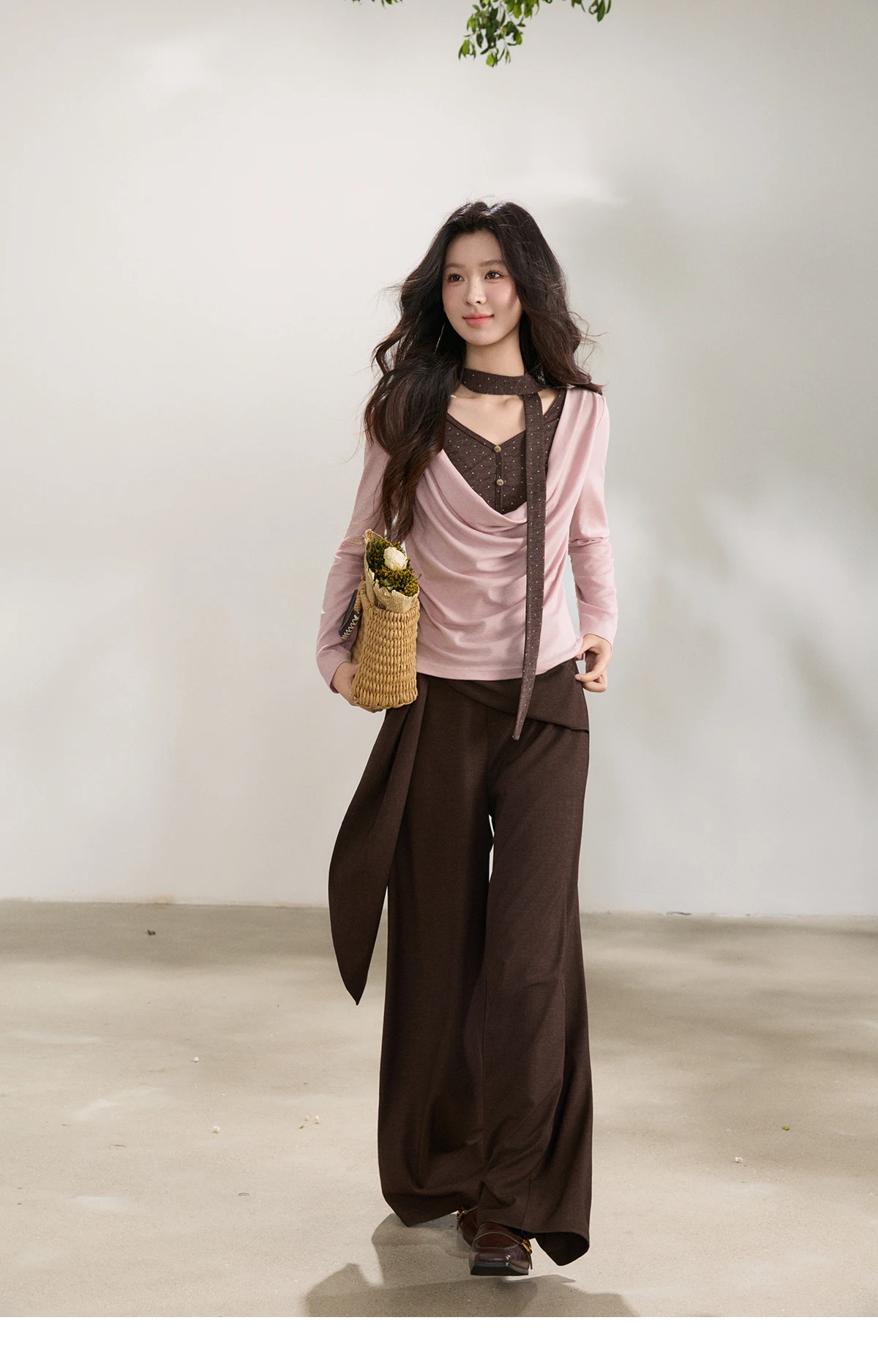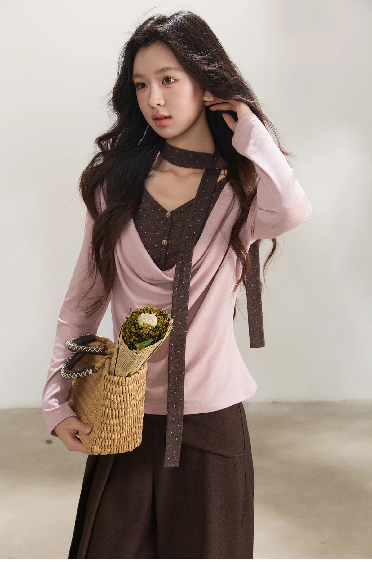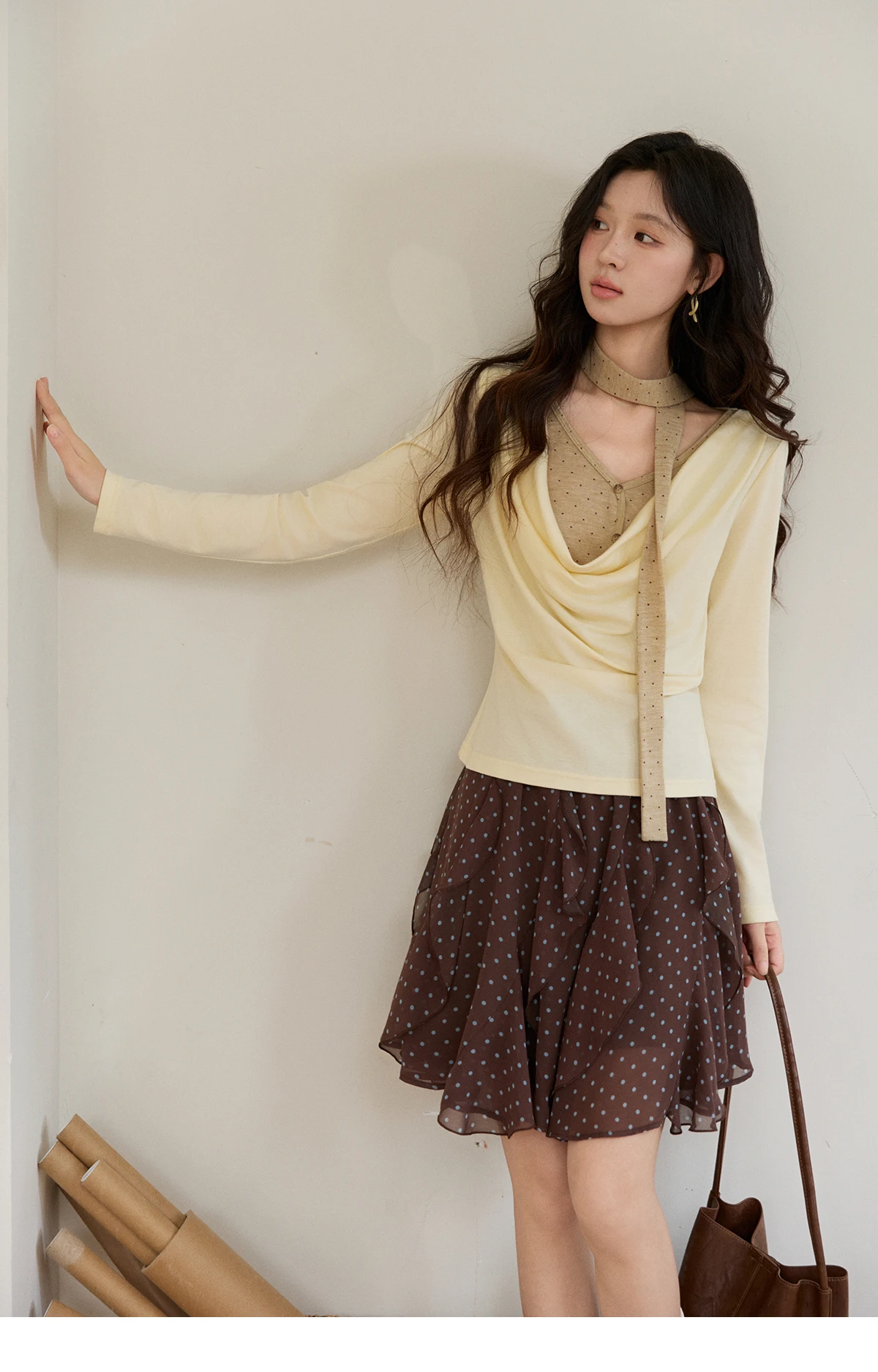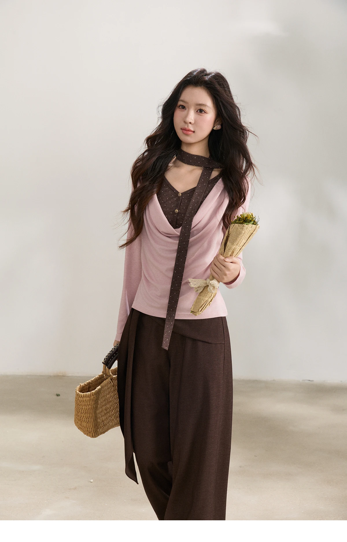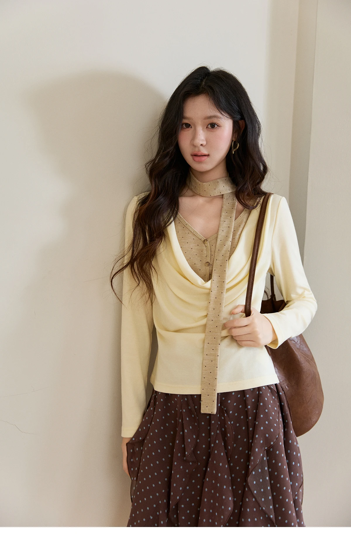 MISHOW Women's Wool Blend Fake Two Piece Draped Neck Knit Top 2026 Spring Wave Point Ribbon Contrast Color Casual Top MXF13Z2977