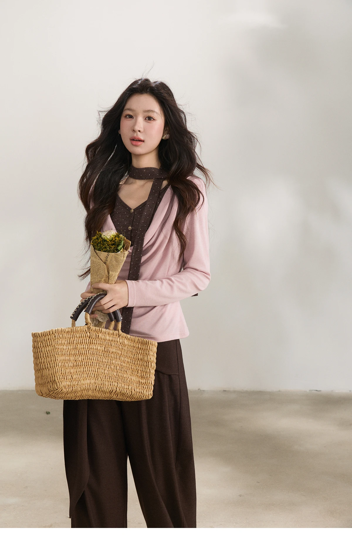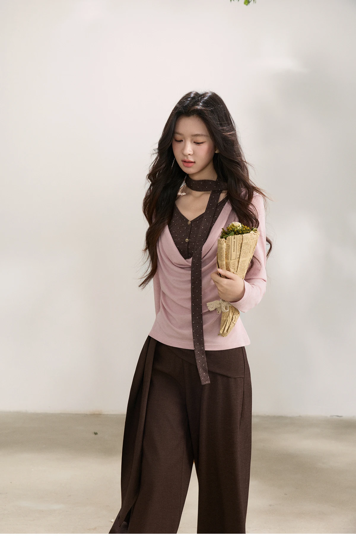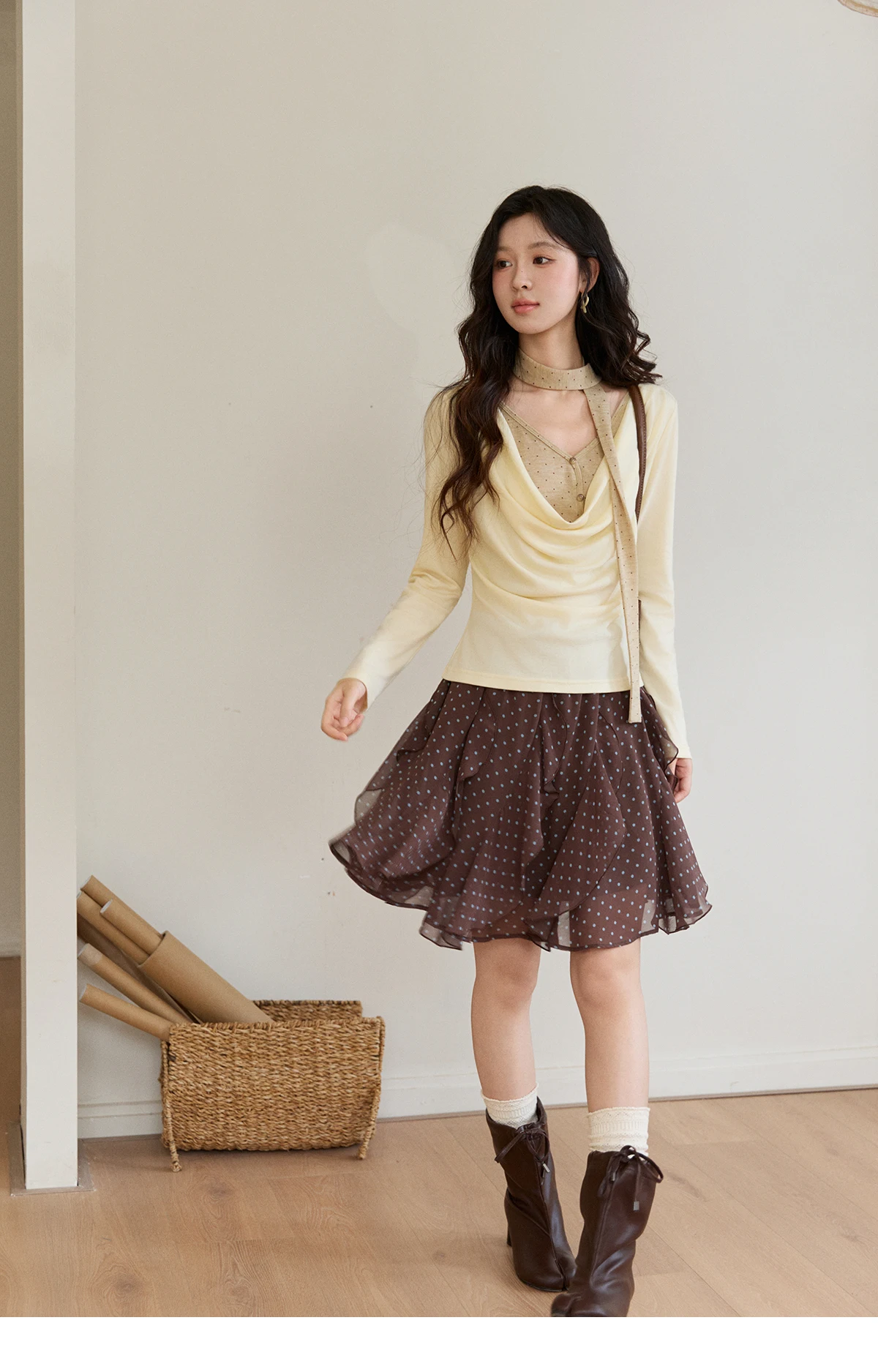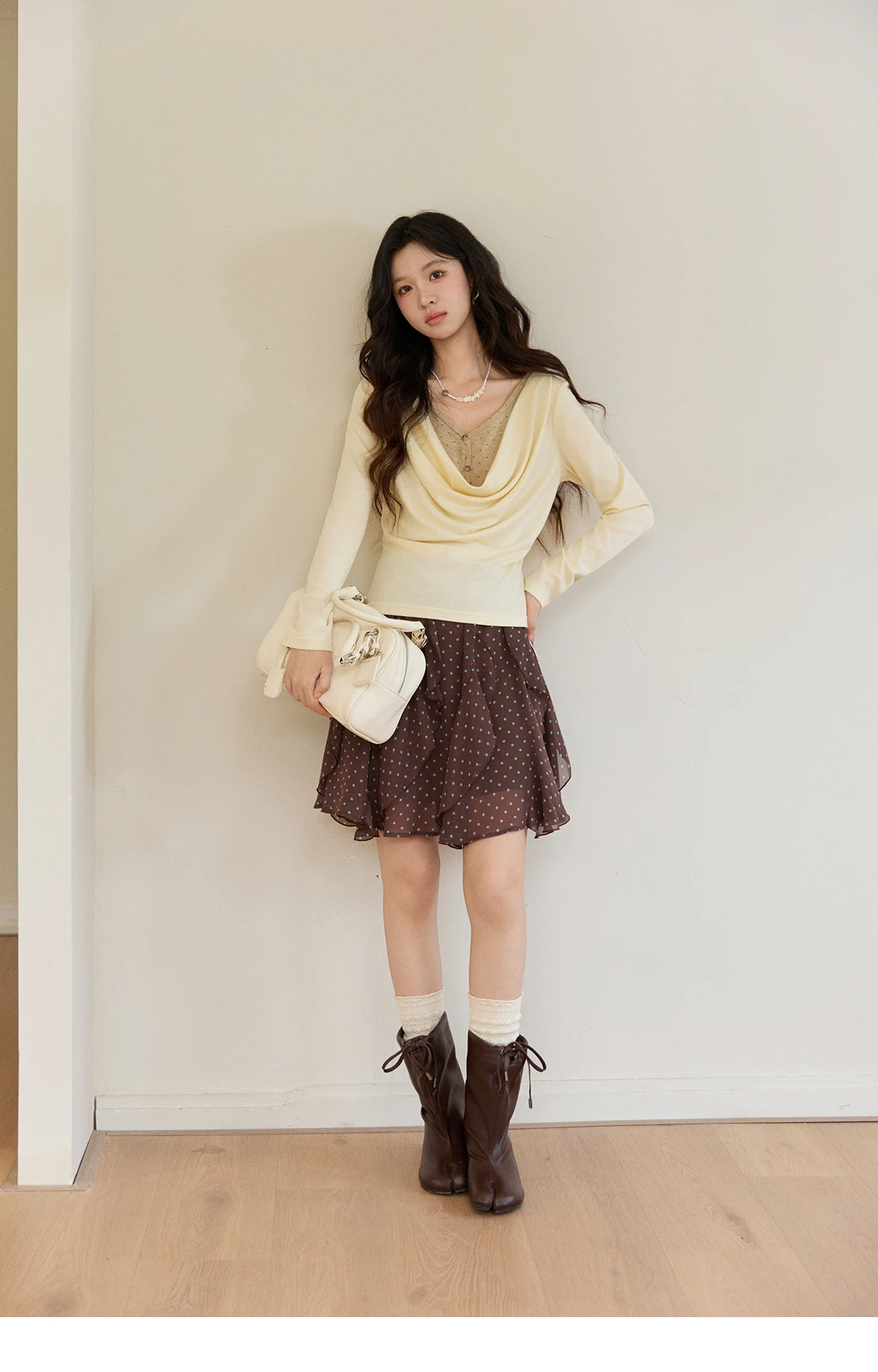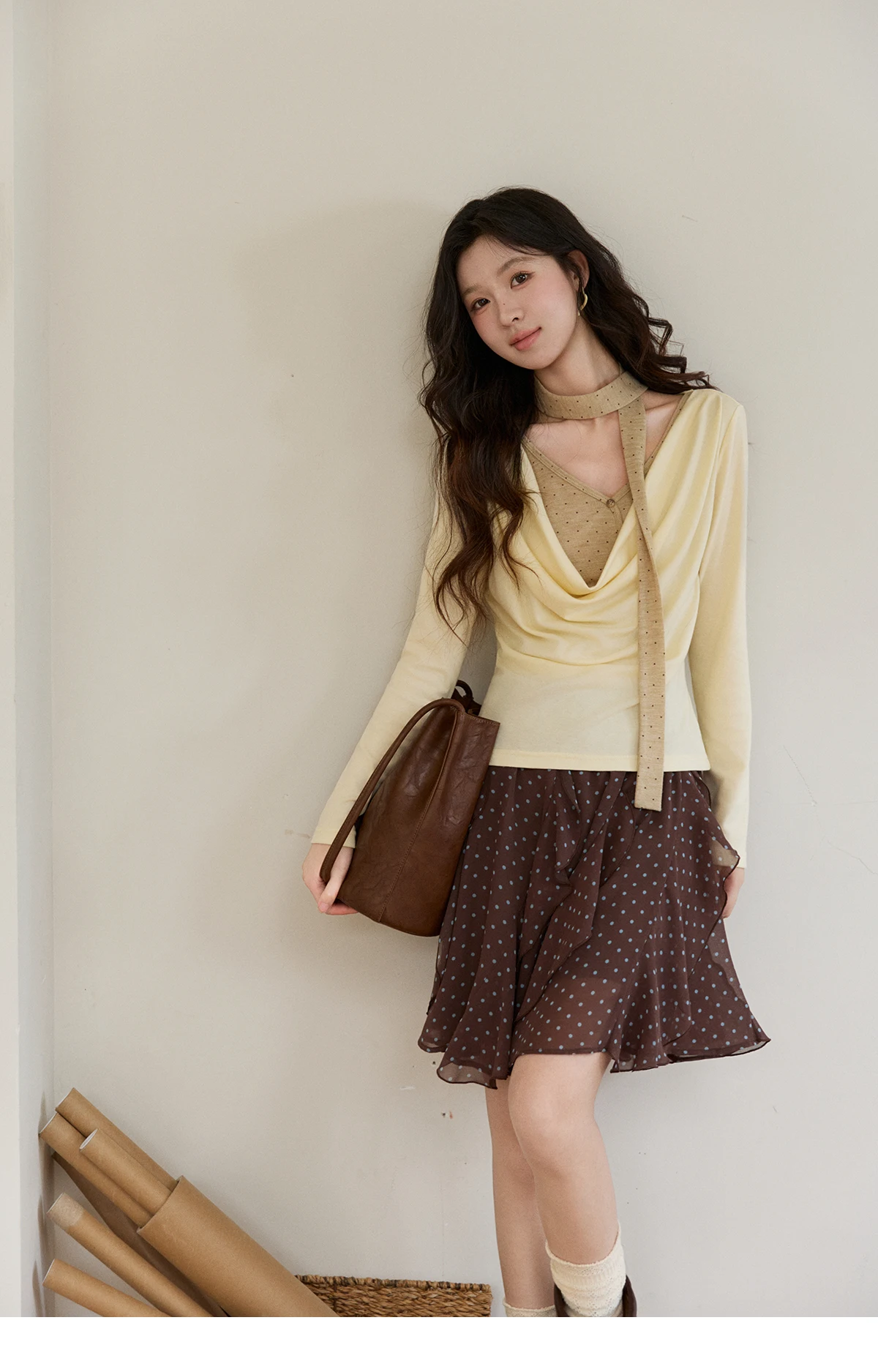 MISHOW Women's Wool Blend Fake Two Piece Draped Neck Knit Top 2026 Spring Wave Point Ribbon Contrast Color Casual Top MXF13Z2977