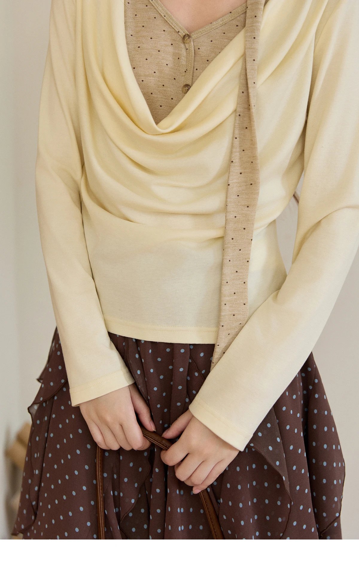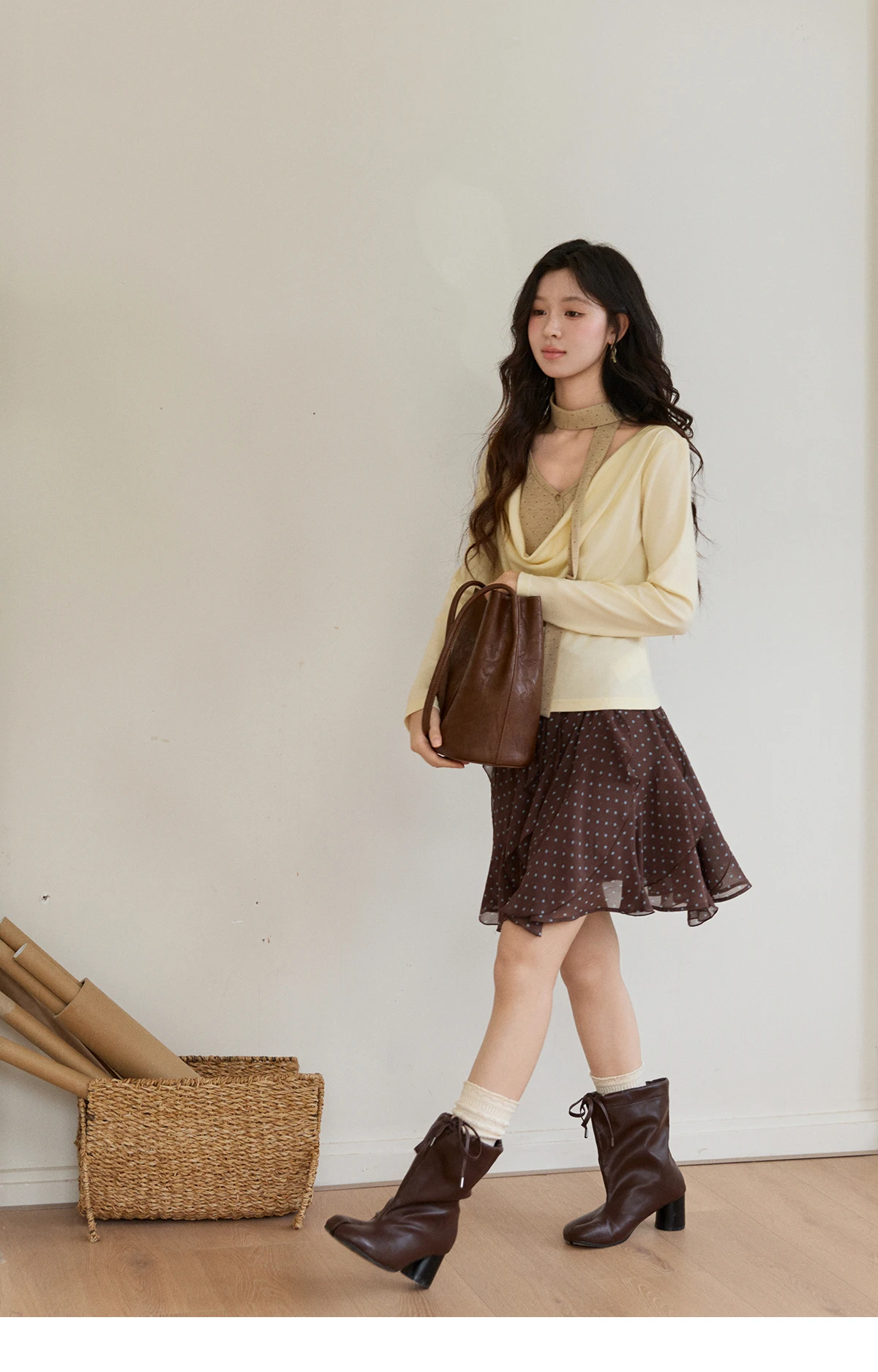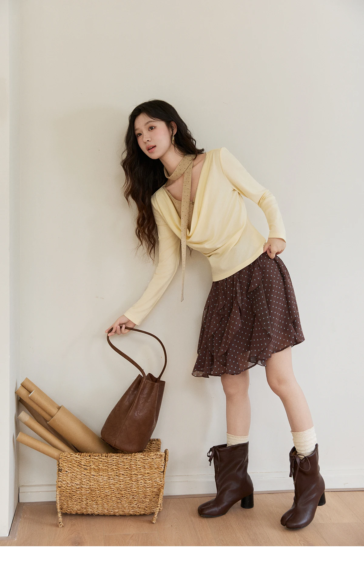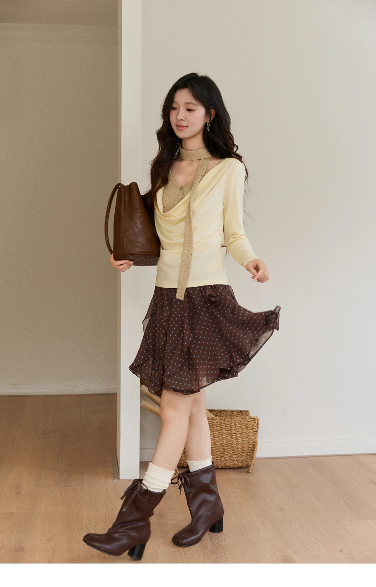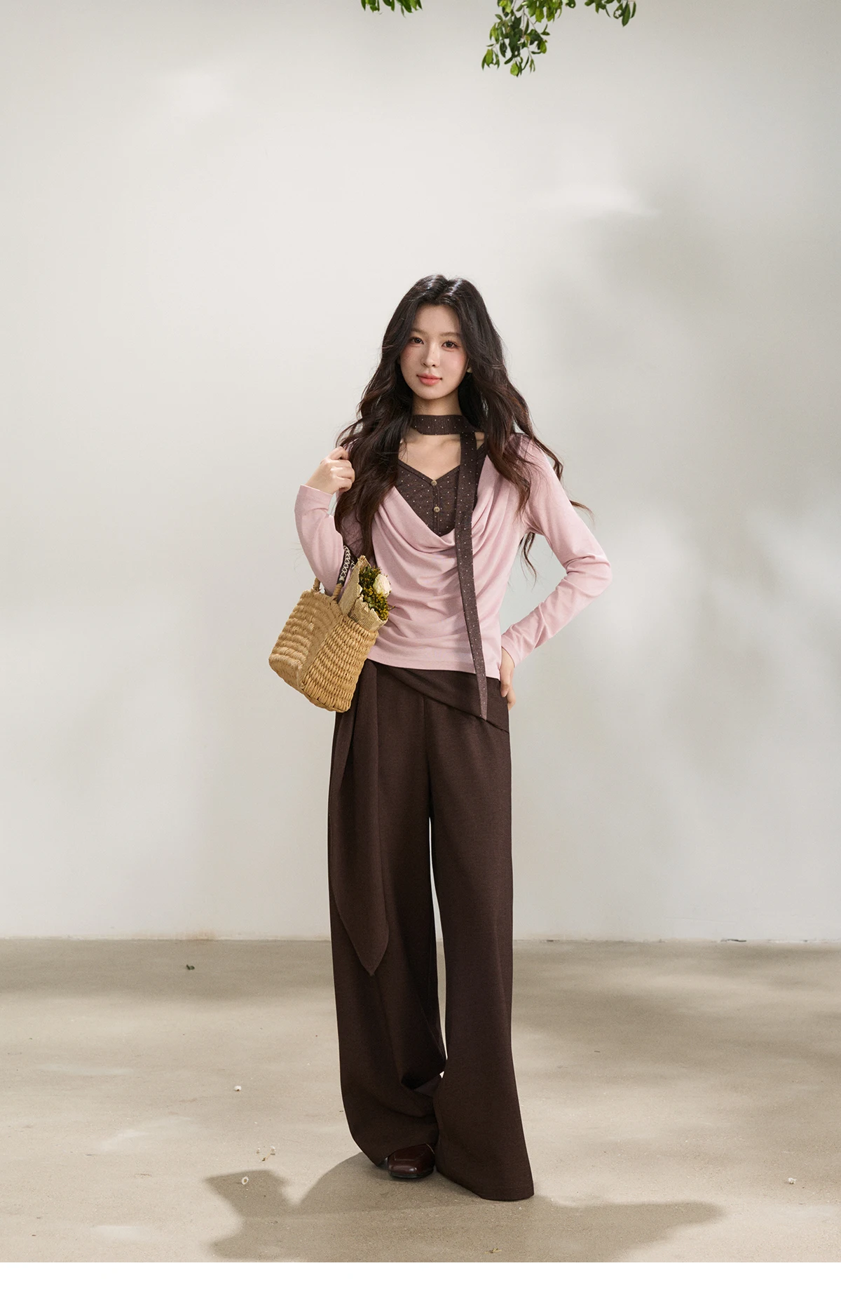 MISHOW Women's Wool Blend Fake Two Piece Draped Neck Knit Top 2026 Spring Wave Point Ribbon Contrast Color Casual Top MXF13Z2977