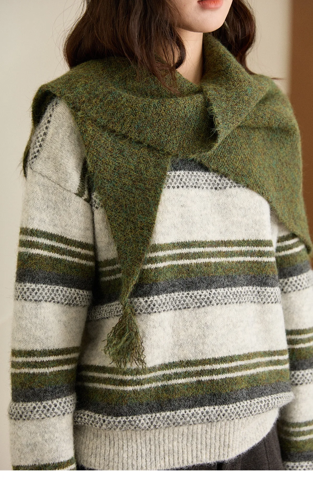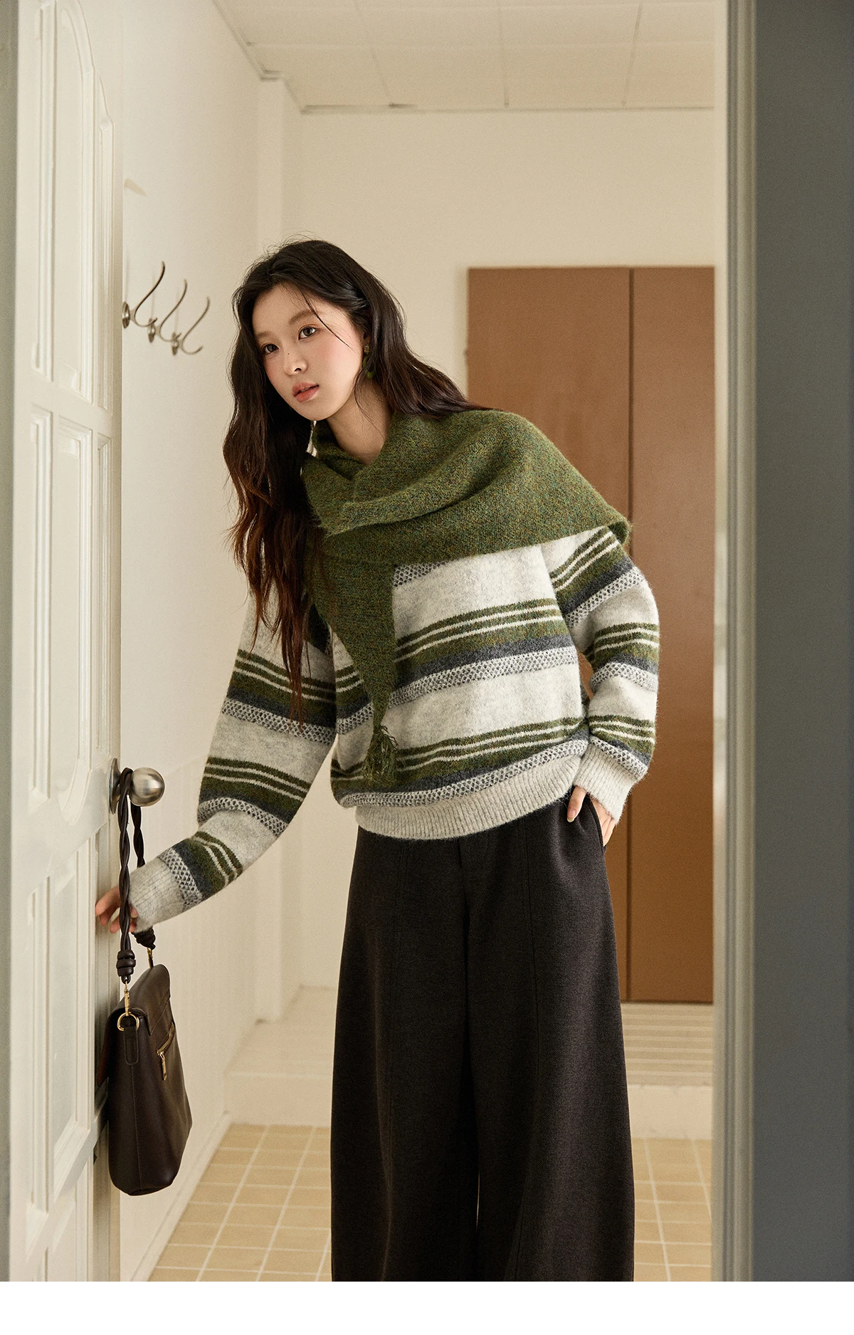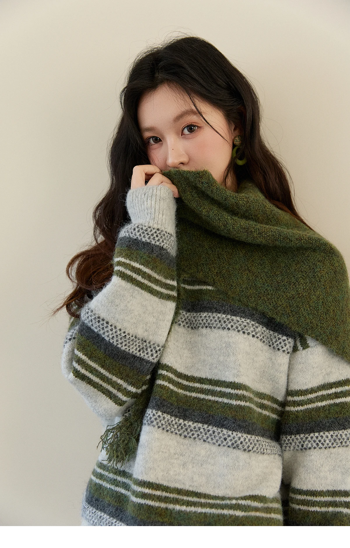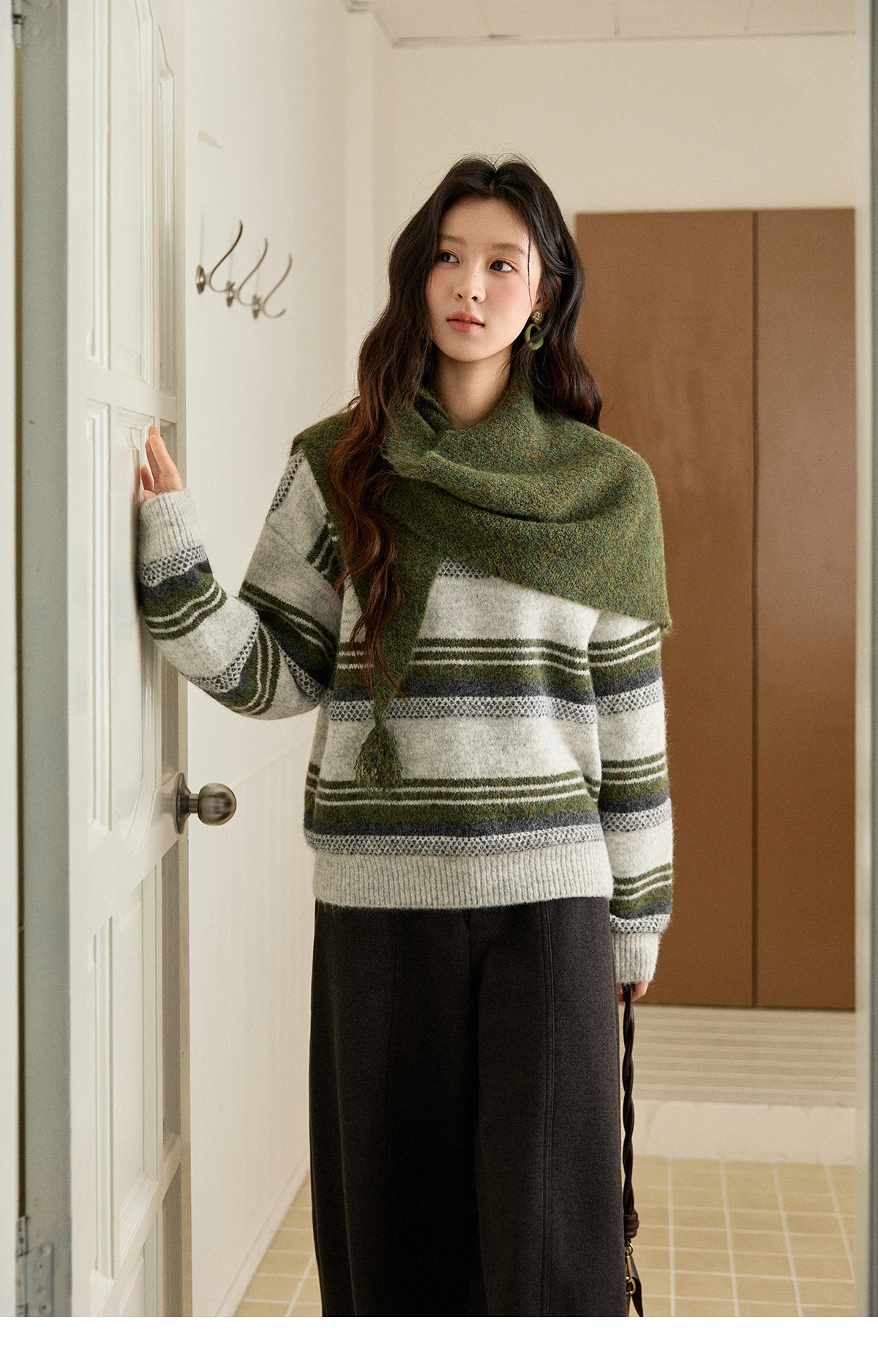 MISHOW Women's Wool Blend Retro Striped Sweater with Scarf Set 2025 Winter Knitted Round Neck Warm Loose Sweaters MXE94Z2987