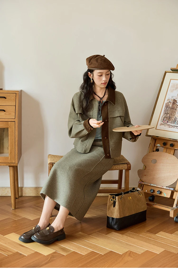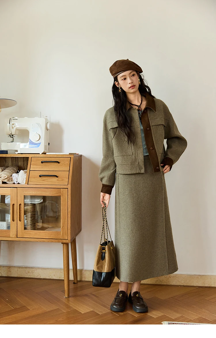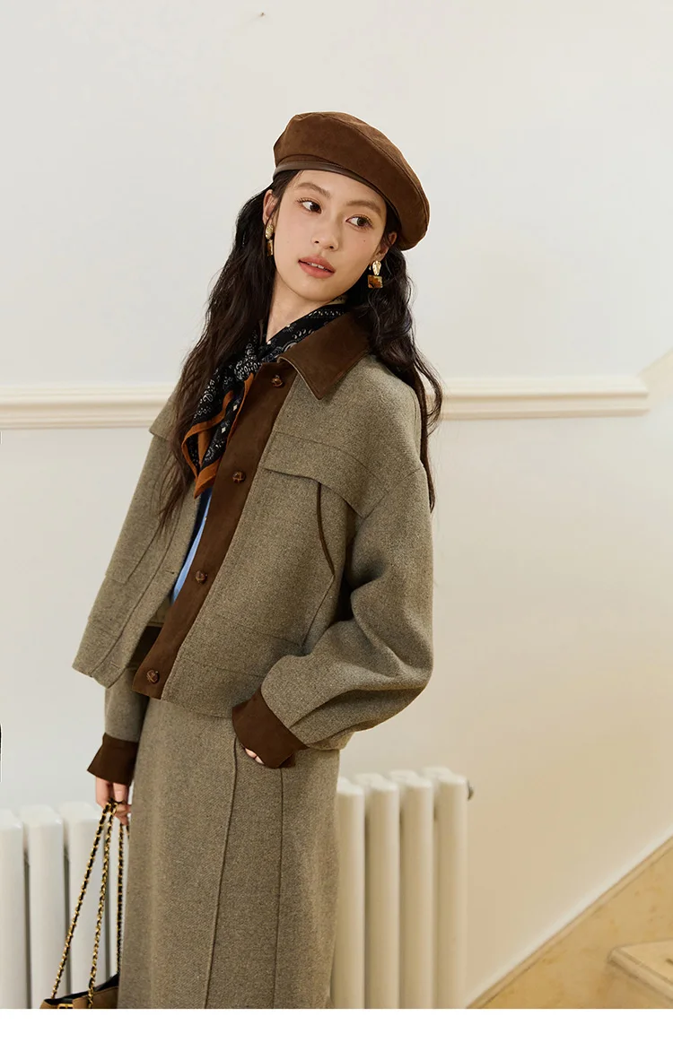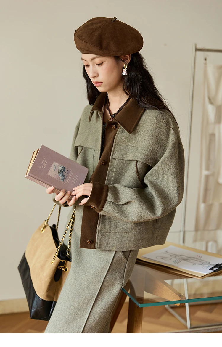 MISHOW Wool Woolen Coat for Women 2025 Autumn Contrasting Suede Patchwork Retro Short Top Lapel Loose Warm Coats MXE46W0844