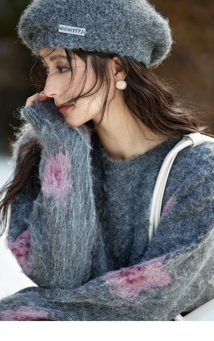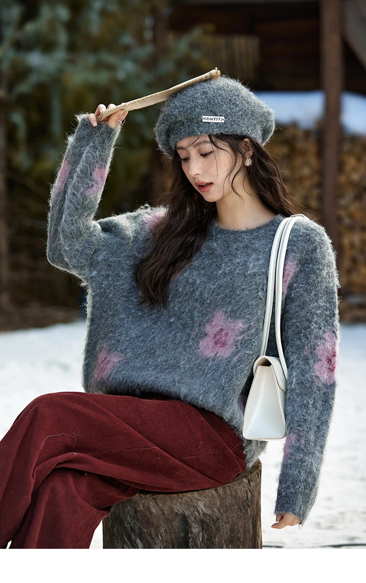 MISHOW Wool Yarn Plush Fur Flower O-Neck Pullover Knitted Sweater Women Clothes Warm Versatile Long-sleeved Tops MXD56Z1001