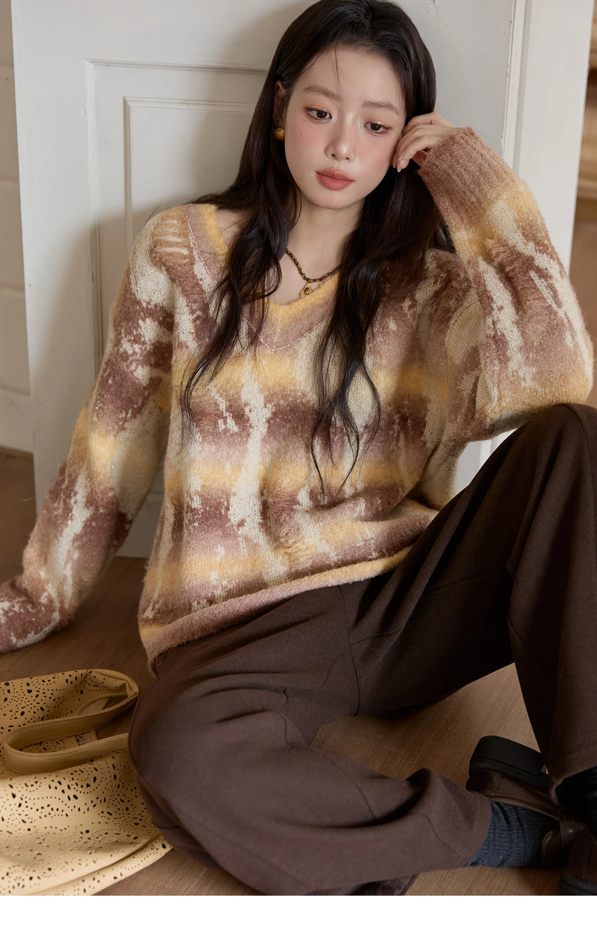 MISHOW Yellow Coffee Gradient Sweater Women 2025 Autumn Winter New V-neck Cable Knit Top Retro Commute Loose Sweater MXE51Z2627