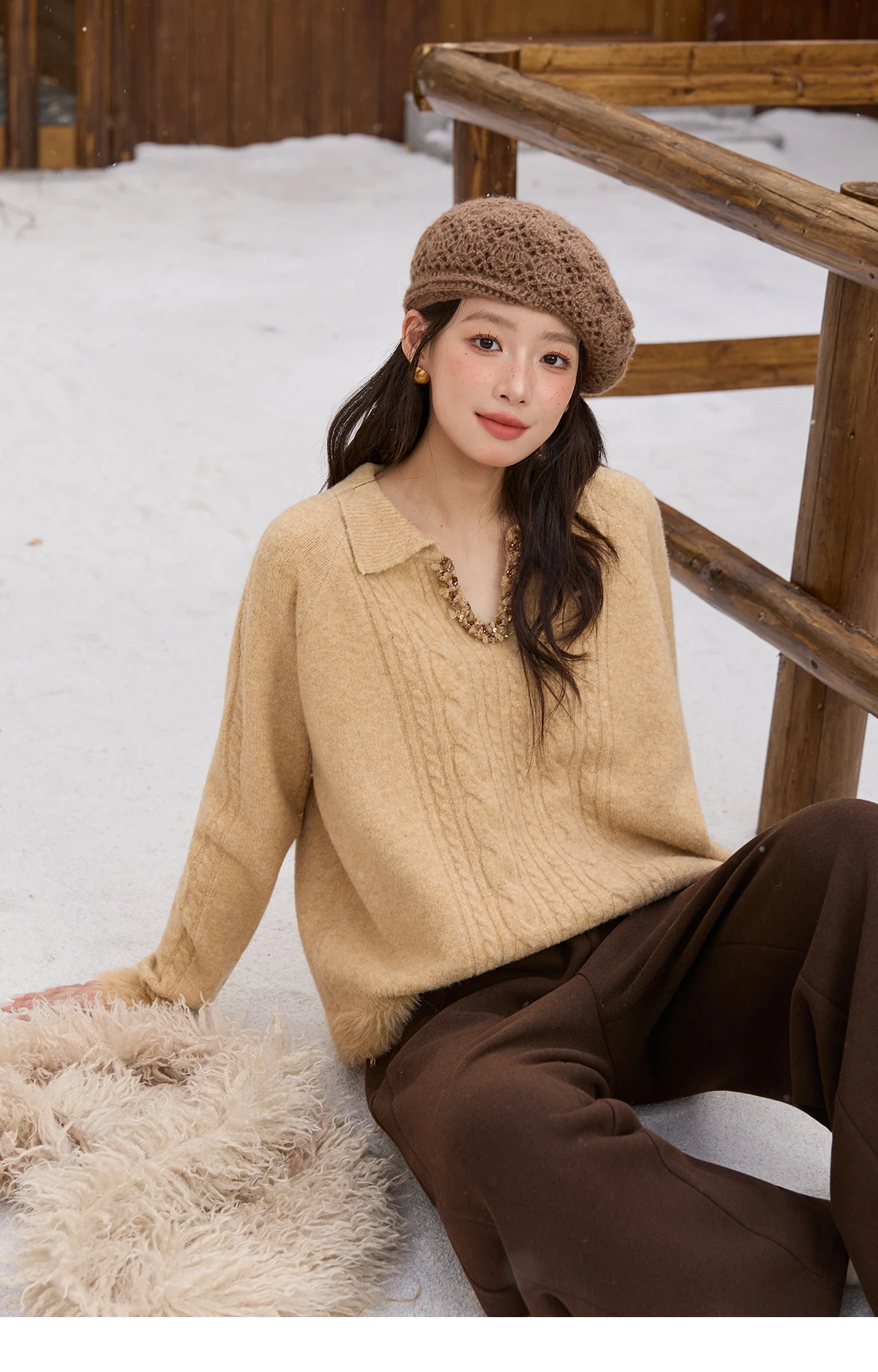MISHOW Yellow Knitted Sweater for Women 2025 Winter New Long Sleeves Cable Plush Hem Stitching Casual Sweater Luxury MXE88Z2674