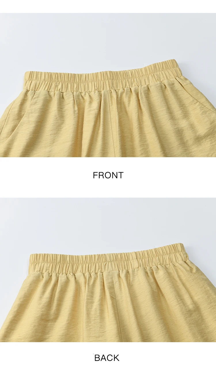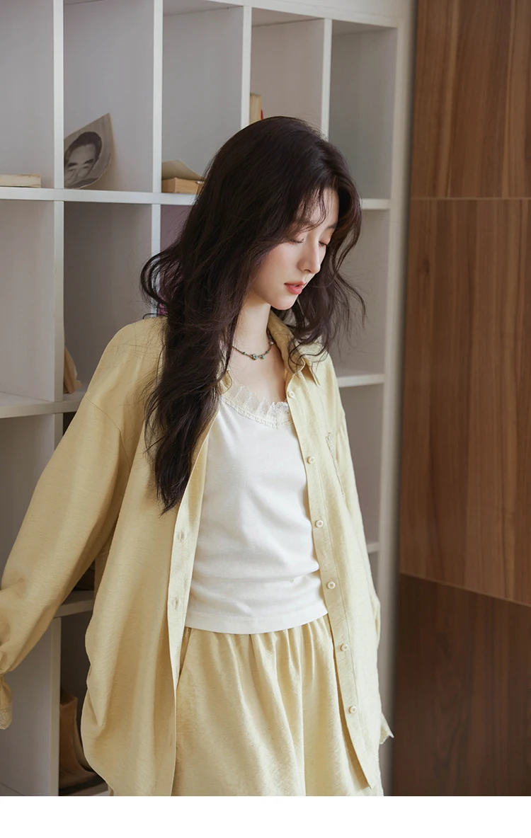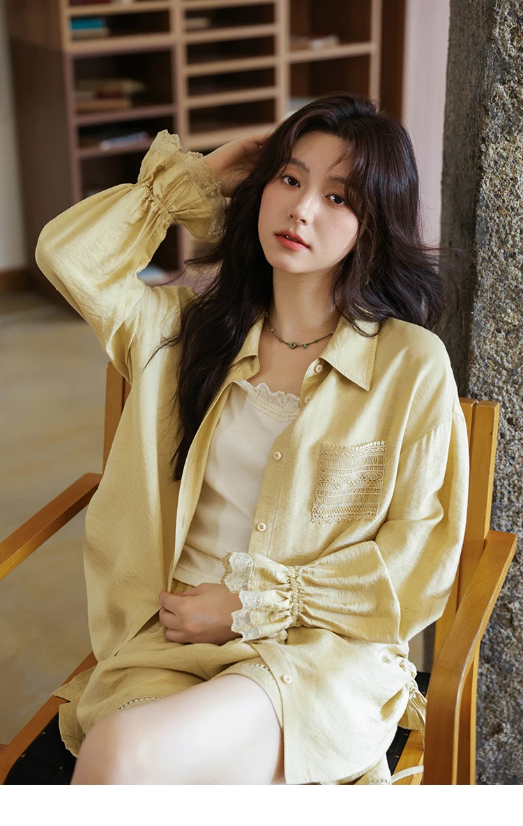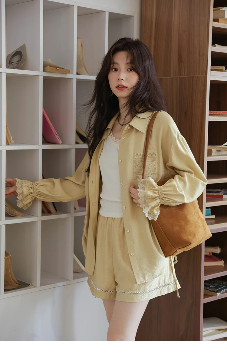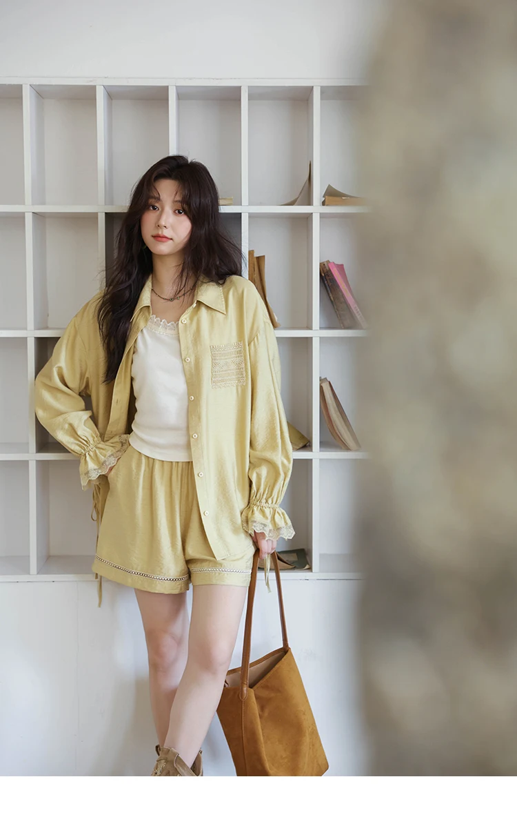 MISHOW Yellow Linen Three Piece Solid Splicing Lace Shirt Camisole Elastic Waist Shorts Vintage Hollowed Out Lace Set MXE42T0718